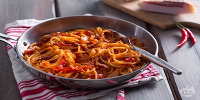 Pasta Dish based on guanciale (or pancetta), pecorino romano cheese, tomato and, in some variations, onion. Originating from the town of Amatrice near Rome.